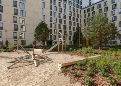 Четыре монолитно-каркасных дома переменной этажности с подземным паркингом, кладовыми помещениями, закрытым двором без машин, детскими и спортивными площадками.