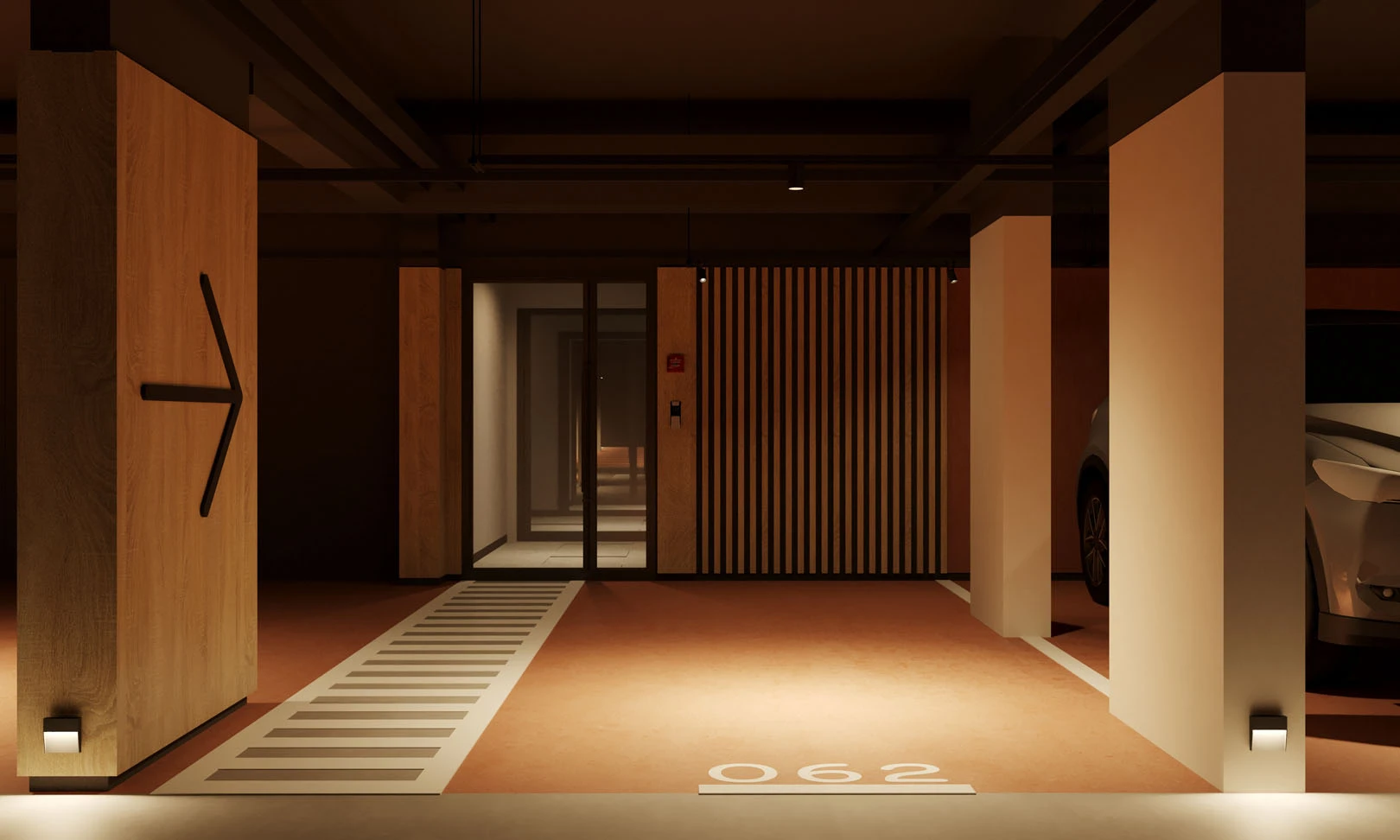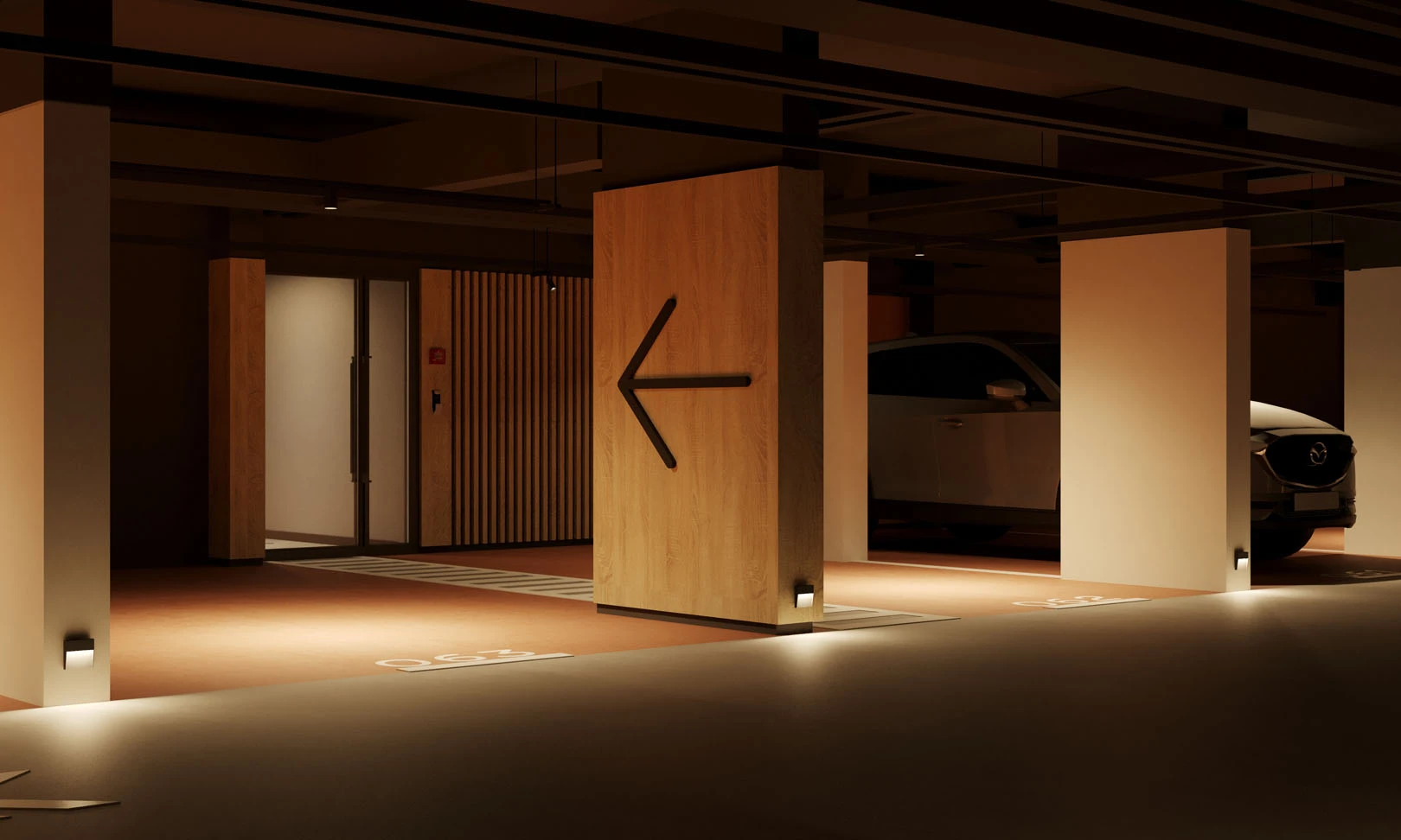 Парковочные места спроектированы таким образом, чтобы было одинаково удобно владельцам крупных внедорожников и компактных машин. Из паркинга можно подняться на лифте сразу на свой этаж.